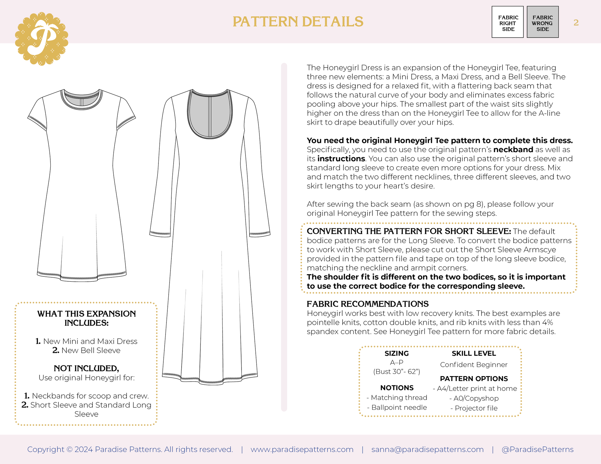 The Honeygirl Dress is an expansion of the Honeygirl Tee, featuring three new elements: a Mini Dress, a Maxi Dress, and a Bell Sleeve. You need the original Honeygirl Tee pattern to complete this dress.